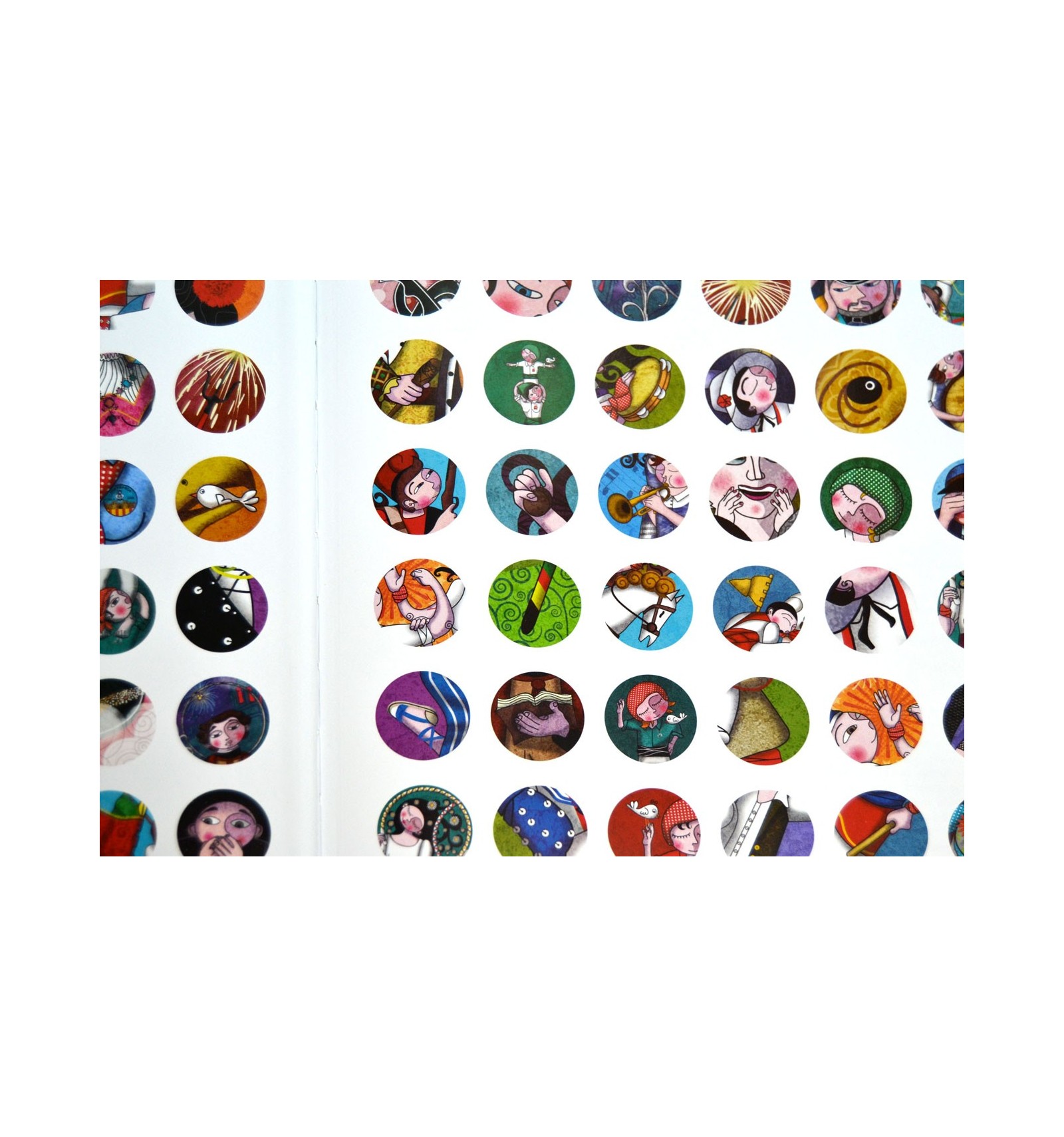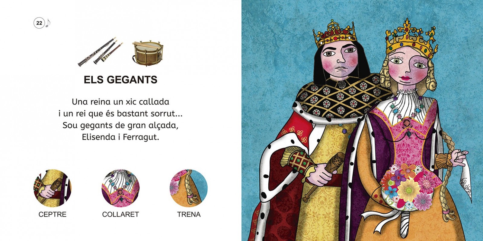 Cada pàgina té una il•lustració gran de cada element del seguici i també tres petites il·lustracions extretes de la gran que permeten el joc de buscar d’on han sortit.